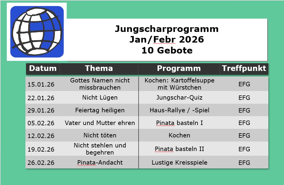 Wenn du mindestens 8 Jahre alt bist, darfst auch du zur Jungschar kommen – wir freuen uns immer über neue Jungschar-Gesichter. Bitte melde dich vorher bei Samuel Falk an. Dann gilt bereits nächsten Donnerstag auch für dich: Spiel, Spaß, Spannung und…?“